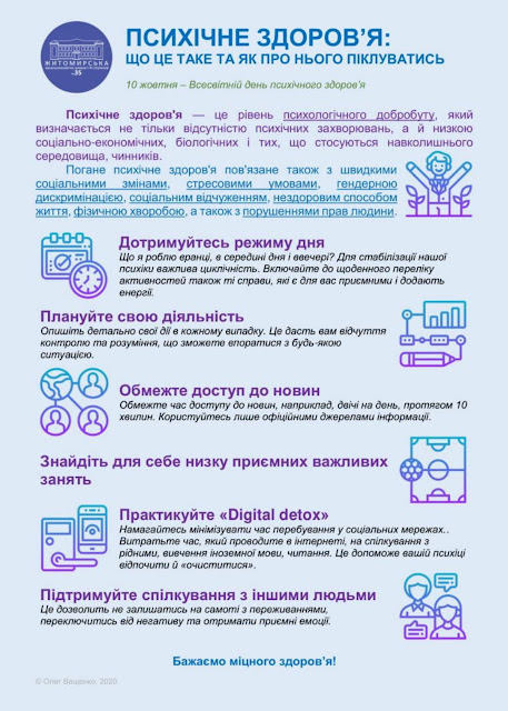 10 жовтня відзначають Всесвітній день психічного здоров’я, метою якого є скорочення поширення психічних захворювань. Зростанню захворюваності сприяють інформаційні перенавантаження, політичні і економічні катаклізми в країні, а провісниками захворювань є стреси. Стреси стали складовою частиною життя сучасної людини. Люди борються з ними, не замислюючись про те, що потрібно не боротися, а не допускають їх.